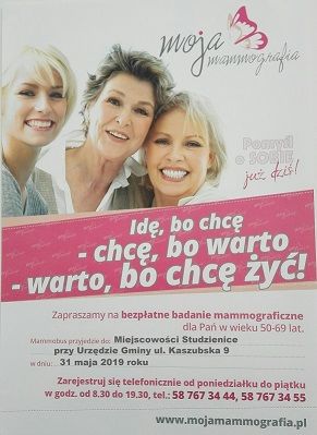 W dniu 31 maja 2019 r.przy Urzędzie Gminy,ul.Kaszubska 9, odbędą się bezpłatne badania mammograficzne dla Pań w wieku 50-69 lat.