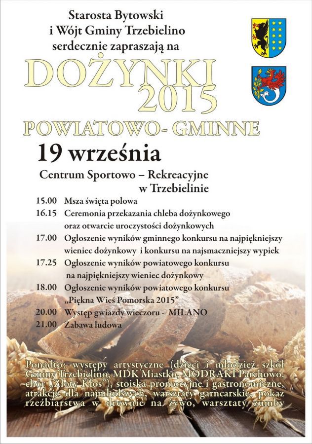 Dożynki powiatowo-gminne w Trzebielinie Home / Artykuły / Starosta Bytowski oraz Wójt Gminy Trzebielino serdecznie zapraszają mieszkańców powiatu bytowskiego do udziału w „Powiatowym Święcie Plonów”, które odbędzie się 19 września 2015 r. w Trzebielinie.