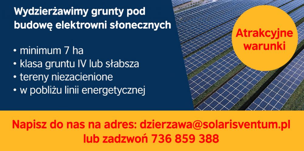 Firma Solaris Ventum Sp. z o. o., specjalizująca się w branży fotowoltaicznej, wydzierżawi grunty pod budowę elektrowni słonecznej.