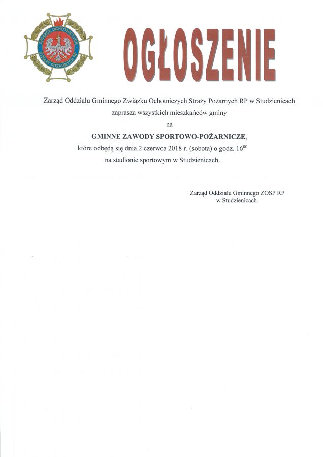 Gminne Zawody Sportowo-Pożarnicze Home / Artykuły / Zarząd Oddziału Gminnego Związku Ochotniczych Straży Pożarnych RP w Studzienicach zaprasza na GMINNE ZAWODY SPORTOWO -POŻARNICZE, które odbędą się dnia 2 czerwca 2018 r. o godz. 16:00 na stadionie sportowym w Studzienicach.