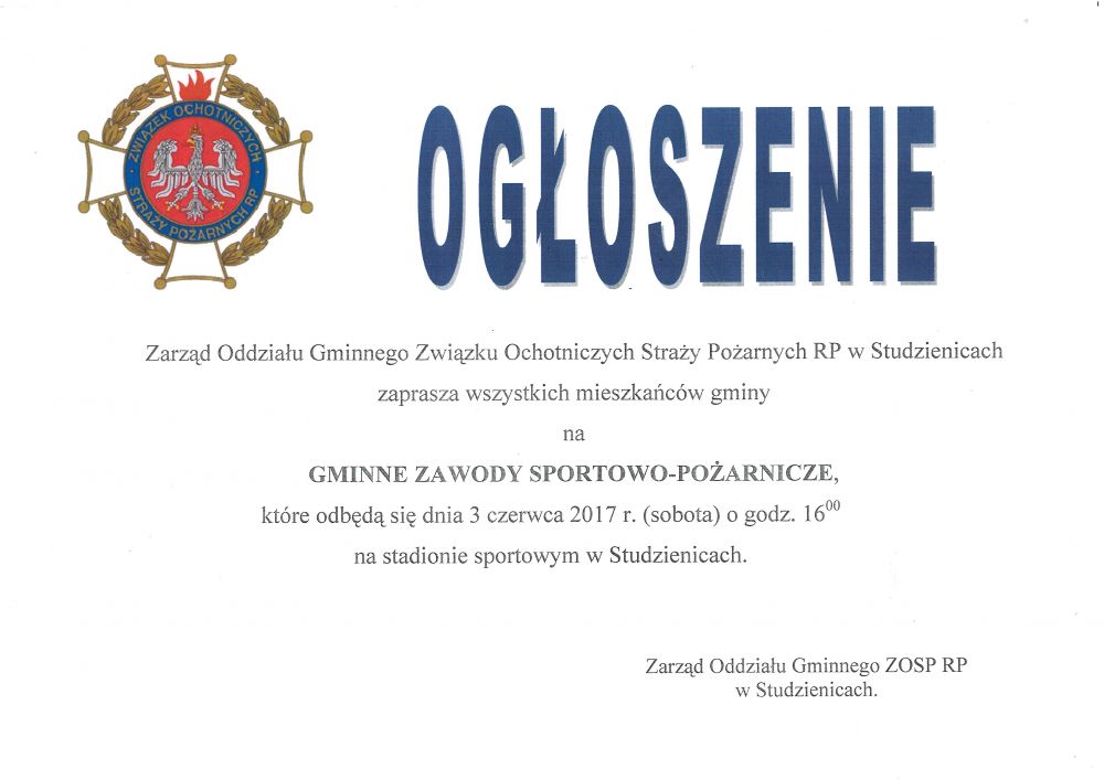Zarząd  Oddziału Gminnego Związku Ochotniczych Straży Pożarnych RP w Studzienicach zaprasza na gminne zawody sportowo-pożarnicze,które odbędą się 3 czerwca na stadionie sportowym w Studzienicach.
