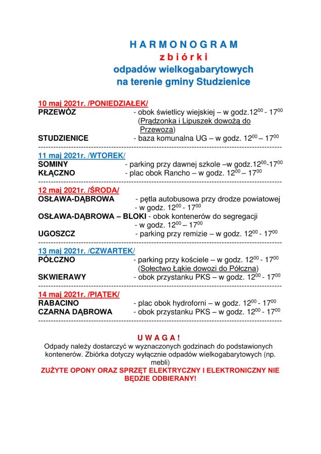Harmonogram zbiórki odpadów wielkogabarytowych Home / Artykuły / Harmonogram zbiórki odpadów wielkogabarytowych na terenie gminy Studzienice.