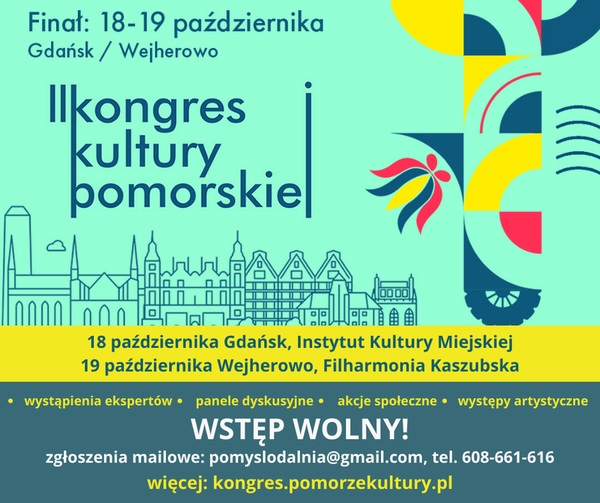 18 października w Instytucie Kultury Miejskiej w Gdańsku i 19 października w Filharmonii Kaszubskiej w Wejherowie spotkamy się, by podsumować wielomiesięczne działania, których głównym celem jest rozwój kultury naszego województwa. Dni finałowe to m.in.: panele dyskusyjne, w których przewidziano czas na wypowiedzi wszystkich chętnych, wydarzenia artystyczne, piękne akcje społeczne, potańcówka, kuluary i poczęstunek. Każdy zainteresowany może wziąć udział, wstęp jest wolny, trzeba się tylko zarejestrować (pomyslodalnia@gmail.com, kongres@pomorzekultury.pl, tel. 608-661-616).