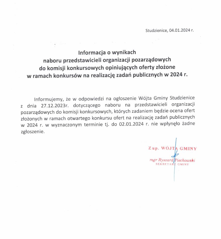 Informacja o wynikach naboru Home / Artykuły / Wójt Gminy Studzienice przedstawia informację o wynikach naboru przedstawicieli organizacji pozarządowych do komisji konkursowych opiniujących oferty złożone w ramach konkursów na realizację zadań publicznych w 2024 r.