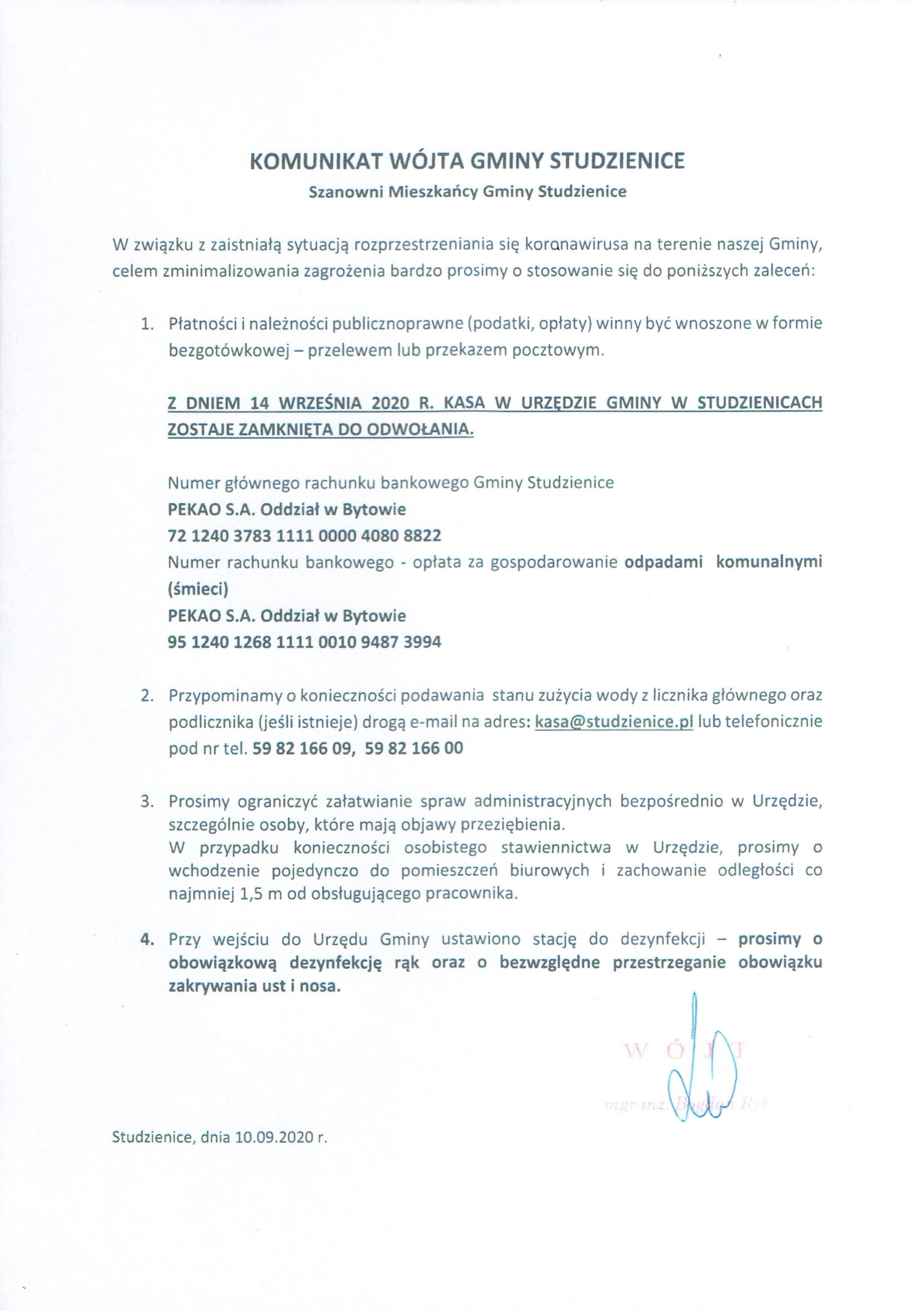 Komunikat Wójta Gminy Studzienice