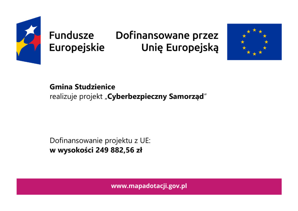Informujemy, iż Gmina Studzienice realizuje projekt grantowy „Cyberbezpieczny Samorząd”, który ma na celu zwiększenie poziomu bezpieczeństwa informacji poprzez wzmacnianie odporności oraz zdolności do skutecznego zapobiegania i reagowania na incydenty w systemach informacyjnych oraz w celu zwiększenia świadomości pracowników w zakresie bezpieczeństwa informacji i przestrzegania polityk oraz zdolność pracowników do rozpoznawania i unikania potencjalnych zagrożeń, a także szybkiego i skutecznego reagowania w przypadku wykrycia lub podejrzenia o incydenty związane z cyberbezpieczeństwem.