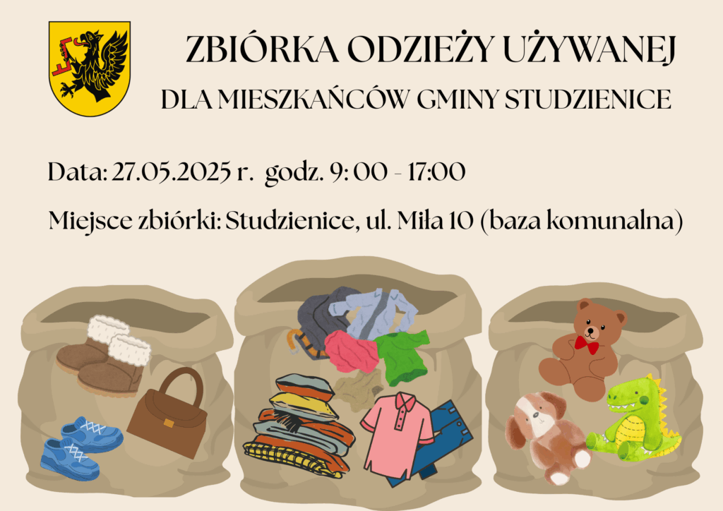 Wójt Gminy Studzienice informuje, że w dniu 27 maja 2025 r. w godz. 9:00 – 17:00 odbędzie się zbiórka odzieży używanej dla mieszkańców gminy Studzienice.