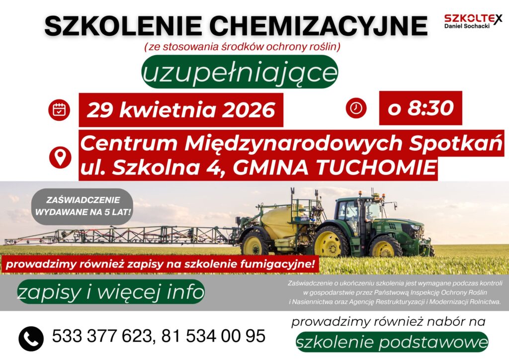 29 KWIETNIA o godz. 8:30 w Centrum Międzynarodowych Spotkań, ul. Szkolna 4, 77-133 Tuchomie, odbędzie się OBOWIĄZKOWE szkolenie chemizacyjne UZUPEŁNIAJĄCE dla rolników.