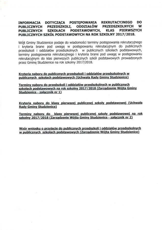 Informacja dotycząca postępowania rekrutacyjnego do publicznych przedszkoli ,oddziałów przedszkolnych w publicznych szkołach podstawowych , klas pierwszych publicznych szkół podstawowych na rok 2017/2018 oraz zarząrządzenie Nr 27/2017 i Nr 28/ 2018 Wójta Gminy Studzienice.