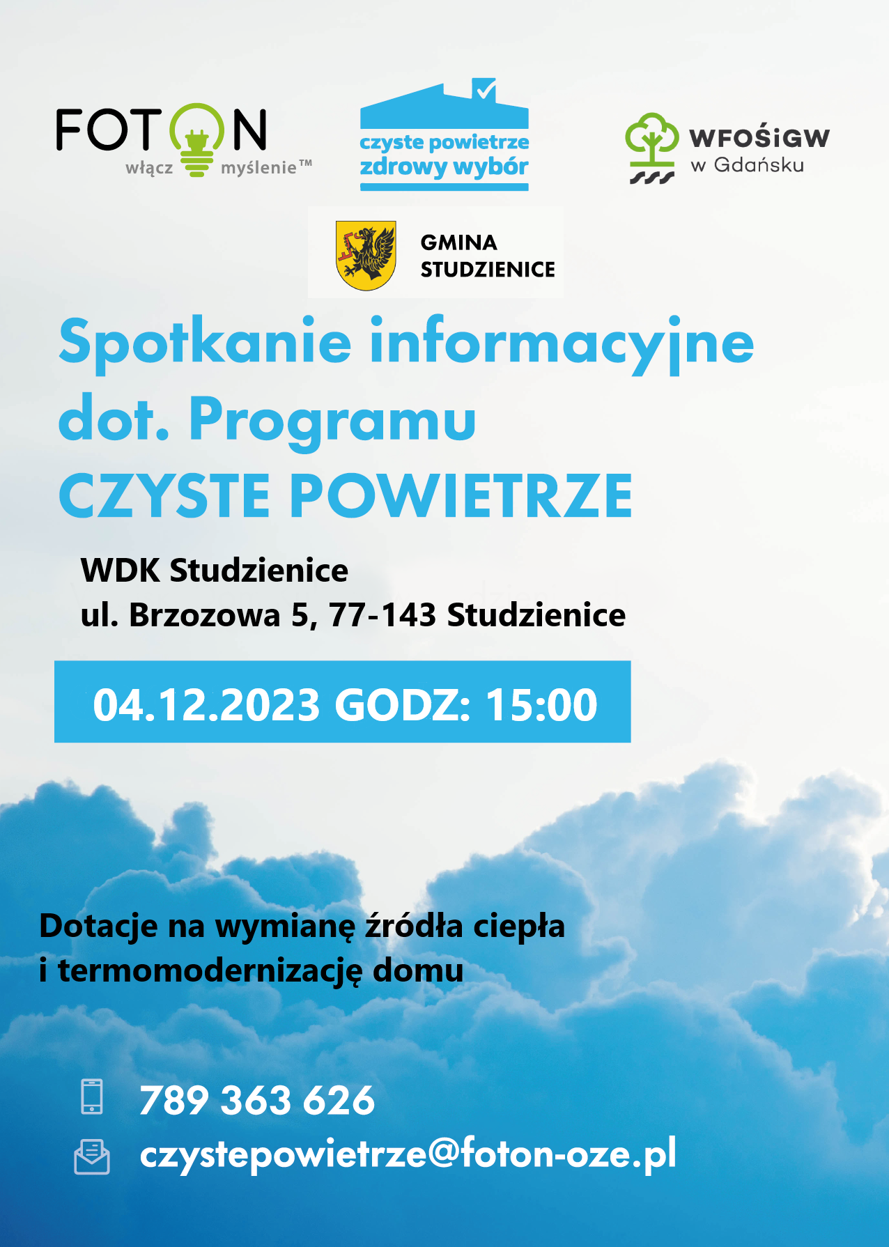 Spotkanie informacyjne w sprawie programu „Czyste Powietrze” Home / Wydarzenia / This event has ended Date 2023-12-04 Time 15:00