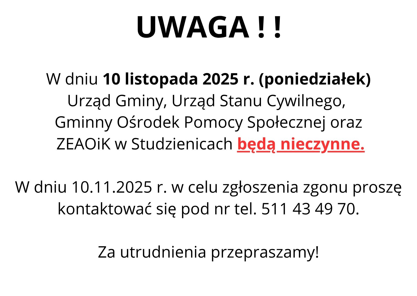 Urząd Gminy Studzienice Nieczynny ! Home / Wydarzenia / This event has ended Date 2025-11-10 Time 07:00 - 23:00